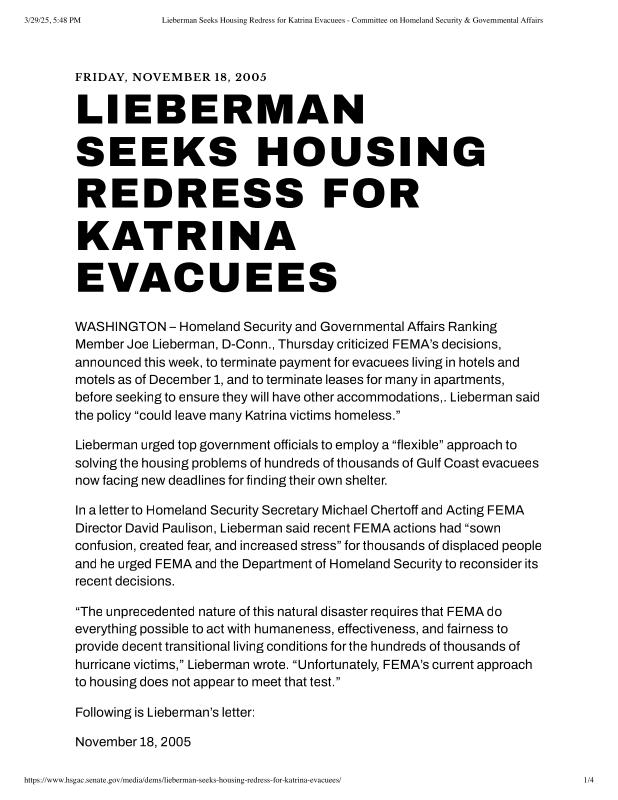 dropbox/COLLECTION- Research/Katrina Batch 2/katrina homeland security response/Lieberman Seeks Housing Redress for Katrina Evacuees - Committee on Homeland Security & Governmental Affairs.pdf