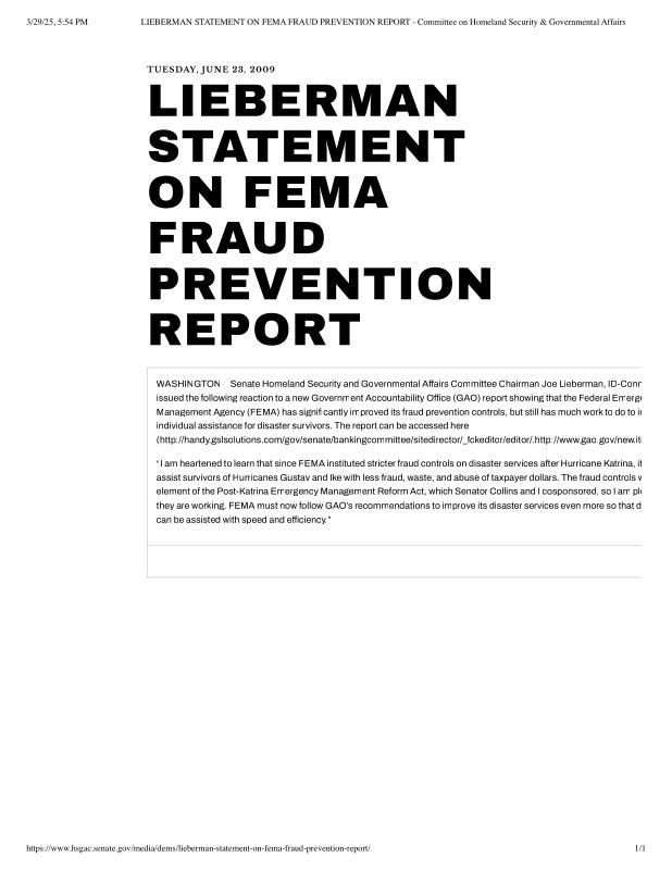 dropbox/COLLECTION- Research/Katrina Batch 2/katrina homeland security response/LIEBERMAN STATEMENT ON FEMA FRAUD PREVENTION REPORT - Committee on Homeland Security & Governmental Affairs.pdf