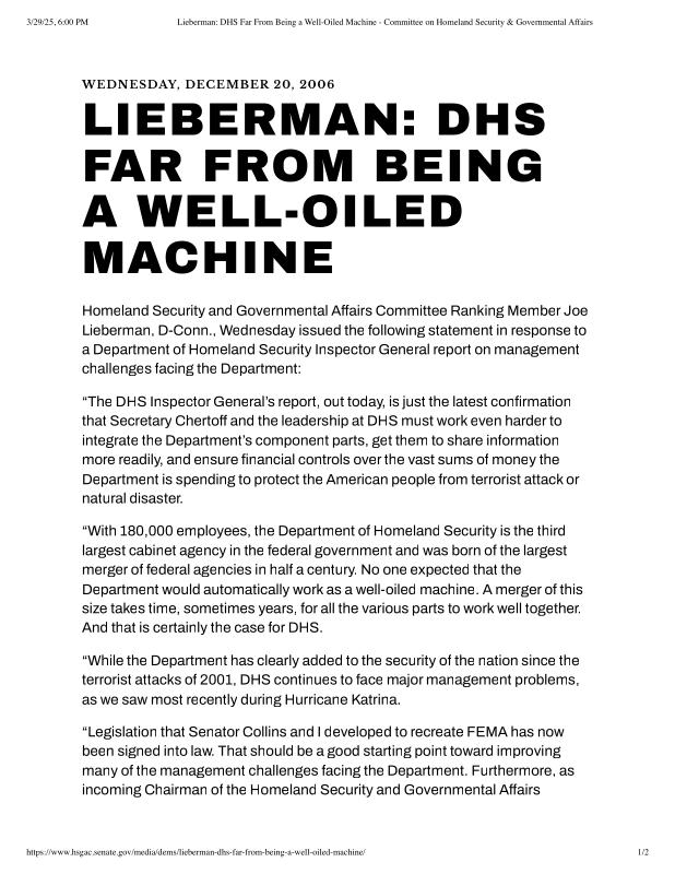 dropbox/COLLECTION- Research/Katrina Batch 2/katrina homeland security response/Lieberman_ DHS Far From Being a Well-Oiled Machine - Committee on Homeland Security & Governmental Affairs.pdf