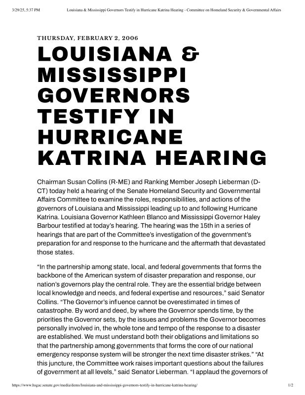 dropbox/COLLECTION- Research/Katrina Batch 2/katrina homeland security response/Louisiana & Mississippi Governors Testify in Hurricane Katrina Hearing - Committee on Homeland Security & Governmental Affairs.pdf