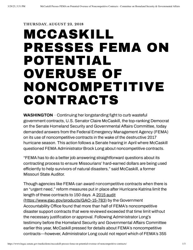 dropbox/COLLECTION- Research/Katrina Batch 2/katrina homeland security response/McCaskill Presses FEMA on Potential Overuse of Noncompetitive Contracts - Committee on Homeland Security & Governmental Affairs.pdf