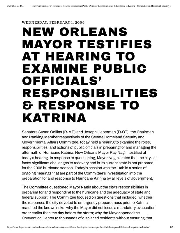 dropbox/COLLECTION- Research/Katrina Batch 2/katrina homeland security response/New Orleans Mayor Testifies at Hearing to Examine Public Officials' Responsibilities & Response to Katrina.pdf