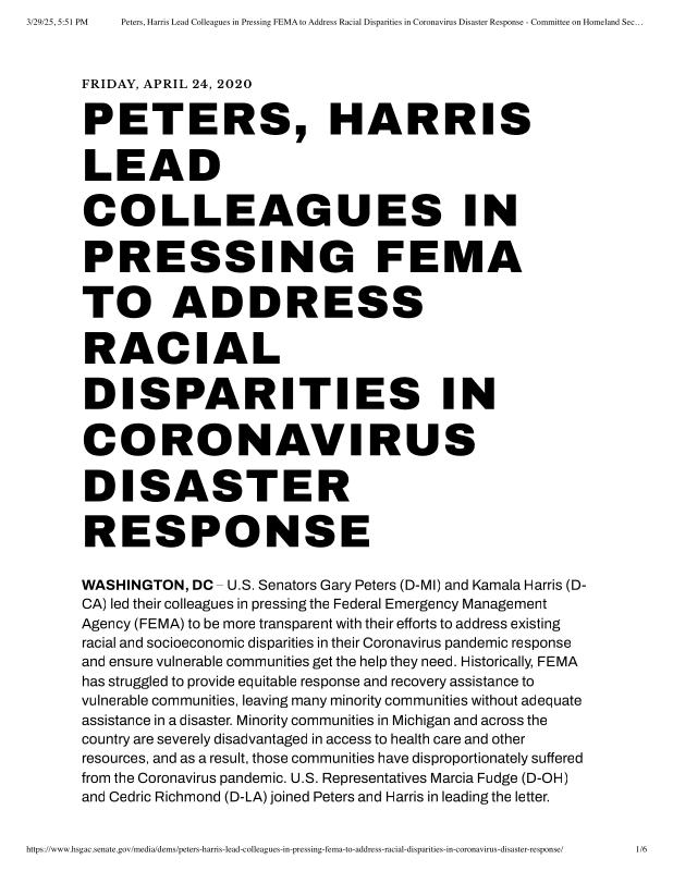 dropbox/COLLECTION- Research/Katrina Batch 2/katrina homeland security response/Peters, Harris Lead Colleagues in Pressing FEMA to Address Racial Disparities in Coronavirus Disaster Response.pdf