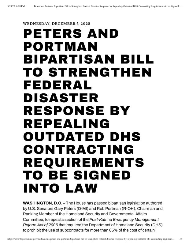 dropbox/COLLECTION- Research/Katrina Batch 2/katrina homeland security response/Peters and Portman Bipartisan Bill to Strengthen Federal Disaster Response by Repealing Outdated DHS Contracting Requirements to be.pdf