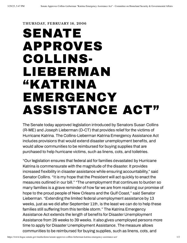 dropbox/COLLECTION- Research/Katrina Batch 2/katrina homeland security response/Senate Approves Collins-Lieberman _Katrina Emergency Assistance Act_ - Committee on Homeland Security & Governmental Affairs.pdf