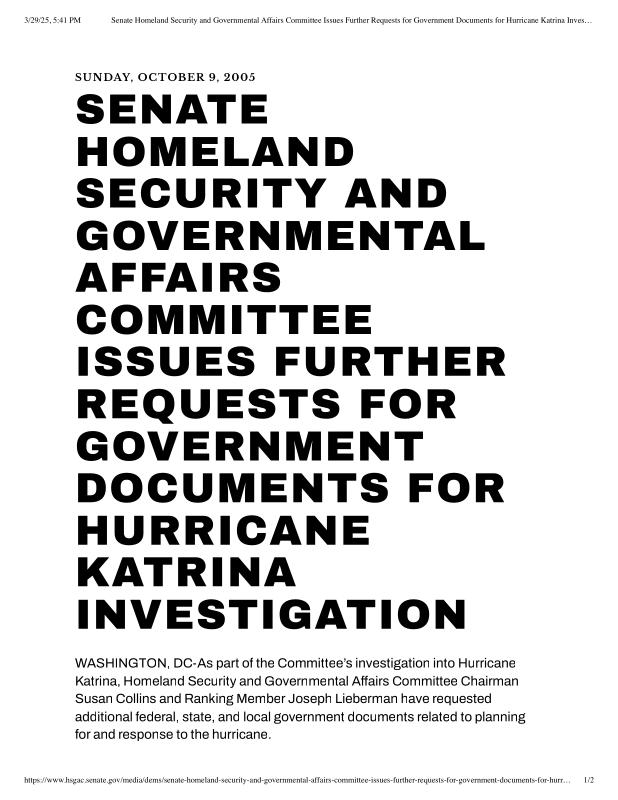 dropbox/COLLECTION- Research/Katrina Batch 2/katrina homeland security response/Senate Homeland Security and Governmental Affairs Committee Issues Furthe.pdf