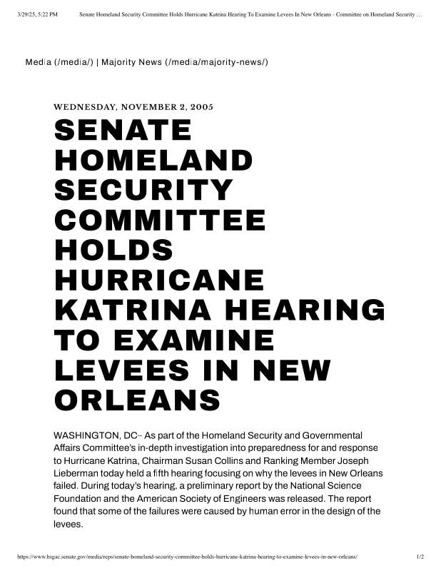 dropbox/COLLECTION- Research/Katrina Batch 2/katrina homeland security response/Senate Homeland Security Committee Holds Hurricane Katrina Hearing To Examine Levees In New Orleans.pdf