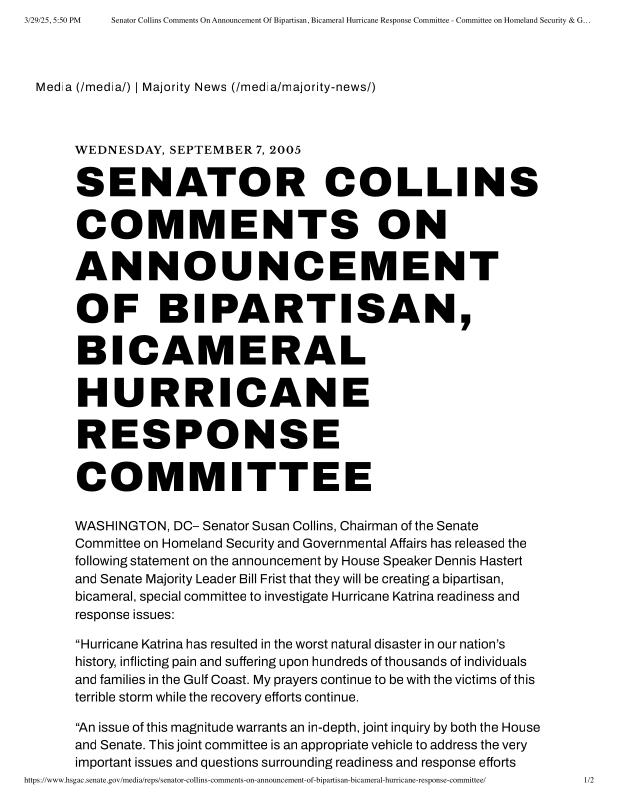 dropbox/COLLECTION- Research/Katrina Batch 2/katrina homeland security response/Senator Collins Comments On Announcement Of Bipartisan, Bicameral Hurricane Response Committee.pdf