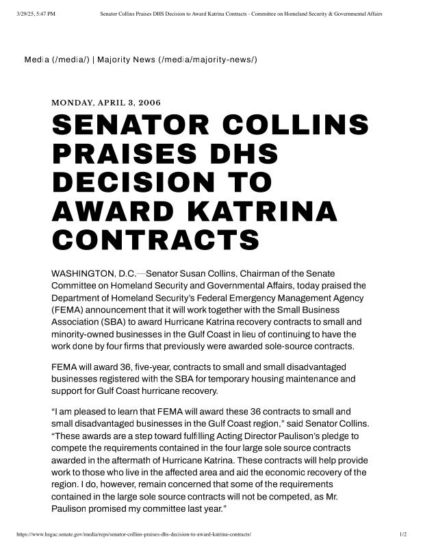 dropbox/COLLECTION- Research/Katrina Batch 2/katrina homeland security response/Senator Collins Praises DHS Decision to Award Katrina Contracts - Committee on Homeland Security & Governmental Affairs.pdf
