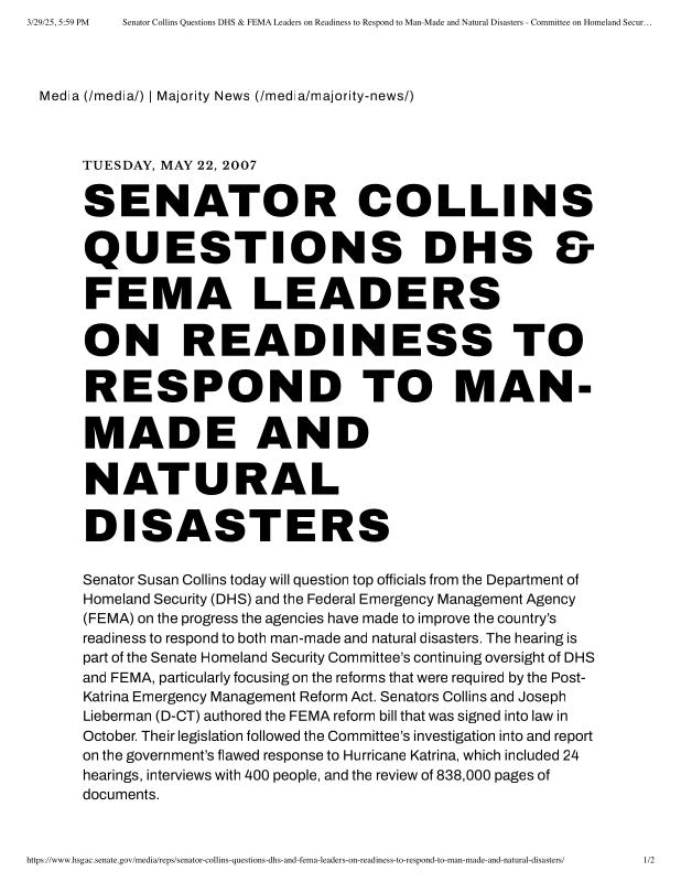dropbox/COLLECTION- Research/Katrina Batch 2/katrina homeland security response/Senator Collins Questions DHS & FEMA Leaders on Readiness to Respond to Man-Made and Natural.pdf