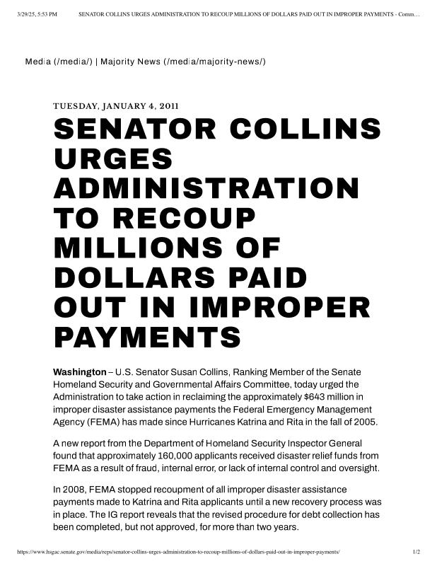 dropbox/COLLECTION- Research/Katrina Batch 2/katrina homeland security response/SENATOR COLLINS URGES ADMINISTRATION TO RECOUP MILLIONS OF DOLLARS PAID OUT IN IMPROPER.pdf