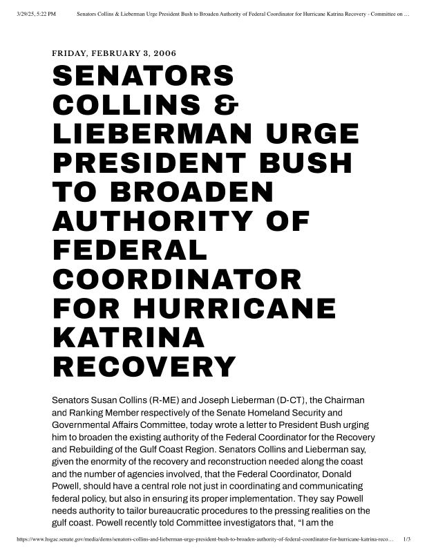 dropbox/COLLECTION- Research/Katrina Batch 2/katrina homeland security response/Senators Collins & Lieberman Urge President Bush to Broaden Authority of Federal Coordinator for Hurricane Katrina Recovery.pdf