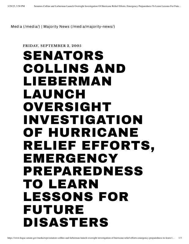 dropbox/COLLECTION- Research/Katrina Batch 2/katrina homeland security response/Senators Collins and Lieberman Launch Oversight Investigation Of Hurricane Relief Efforts, Emergency.pdf