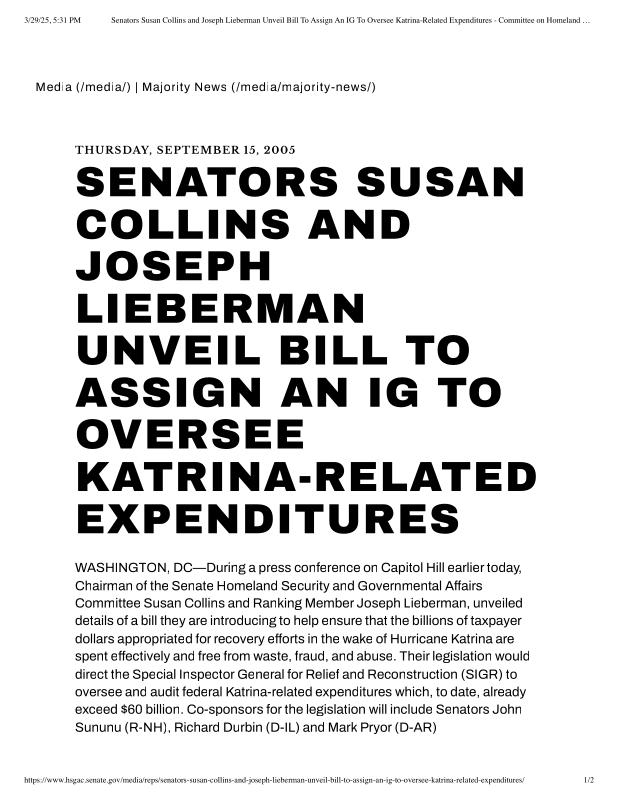 dropbox/COLLECTION- Research/Katrina Batch 2/katrina homeland security response/Senators Susan Collins and Joseph Lieberman Unveil Bill To Assign An IG To Oversee Katrina-Related Expenditure.pdf