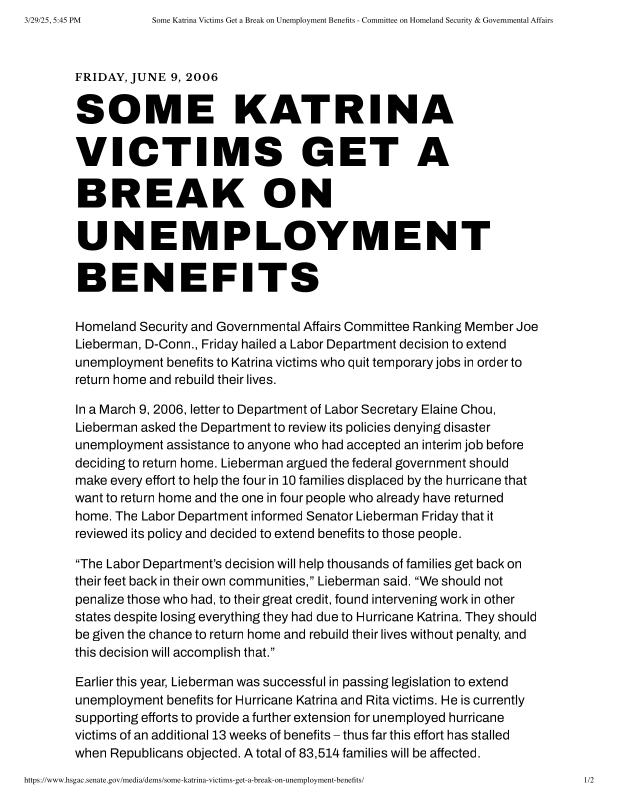 dropbox/COLLECTION- Research/Katrina Batch 2/katrina homeland security response/Some Katrina Victims Get a Break on Unemployment Benefits - Committee on Homeland Security & Governmental Affairs.pdf
