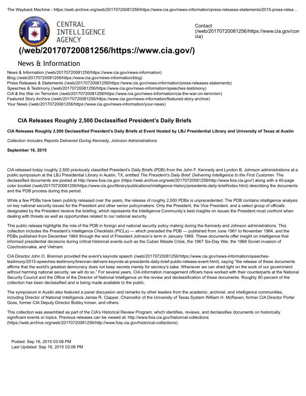 dropbox/COLLECTION- Government/CIA/Declassified President Daily Briefs and Press Releases/2015/CIA Releases Roughly 2,500 Declassified President’s Daily Briefs — Central Intelligence Agency.pdf
