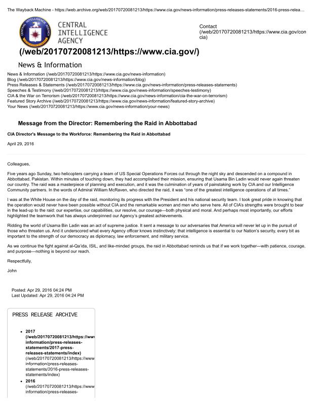 dropbox/COLLECTION- Government/CIA/Declassified President Daily Briefs and Press Releases/2016/Message from the Director_ Remembering the Raid in Abbottabad — Central Intelligence Agency.pdf
