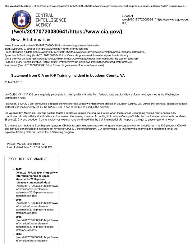 dropbox/COLLECTION- Government/CIA/Declassified President Daily Briefs and Press Releases/2016/Statement from CIA on K-9 Training Incident in Loudoun County, VA — Central Intelligence Agency.pdf