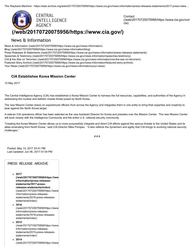 dropbox/COLLECTION- Government/CIA/Declassified President Daily Briefs and Press Releases/2017/CIA Establishes Korea Mission Center — Central Intelligence Agency.pdf
