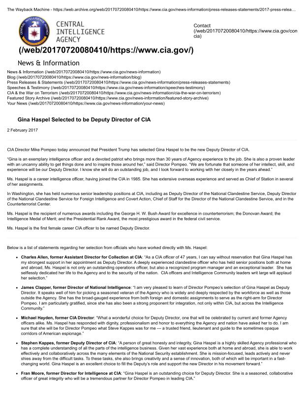 dropbox/COLLECTION- Government/CIA/Declassified President Daily Briefs and Press Releases/2017/Gina Haspel Selected to be Deputy Director of CIA — Central Intelligence Agency.pdf