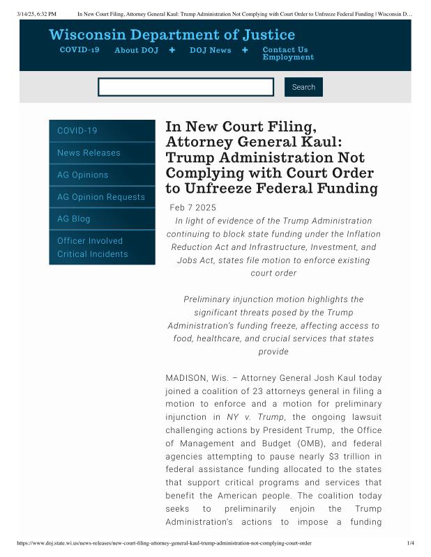 dropbox/COLLECTION- Government/dept of justice/Accountability/In New Court Filing, Attorney General Kaul_ Trump Administration Not Complying with Court Order to Unfreeze Federal Funding _ Wisconsin Department of Justice.pdf