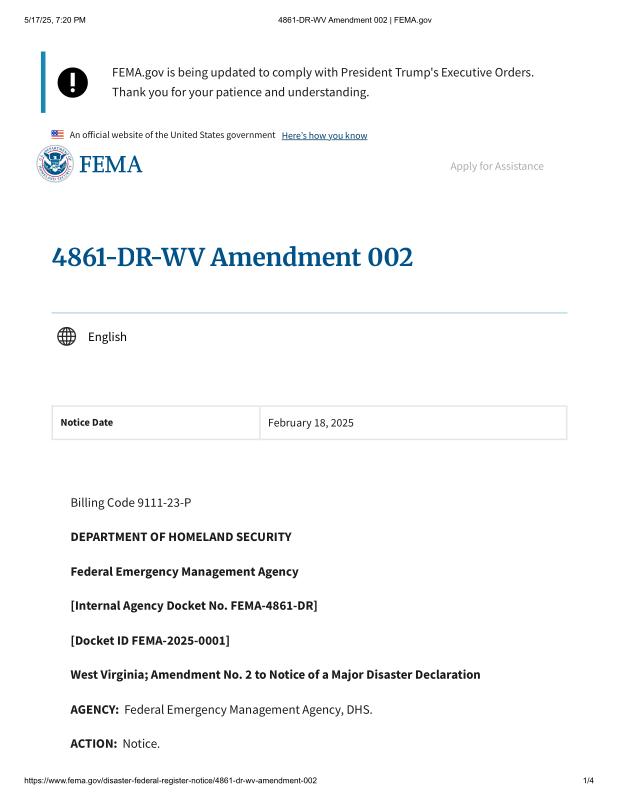 dropbox/COLLECTION- Government/Dept of Labor/FEMA West Virginia February 2025/DR-WV Amendment 002 _ FEMA.gov.pdf