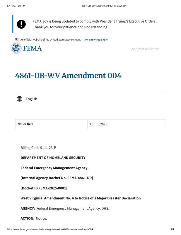 dropbox/COLLECTION- Government/Dept of Labor/FEMA West Virginia February 2025/DR-WV Amendment 004 _ FEMA.gov.pdf