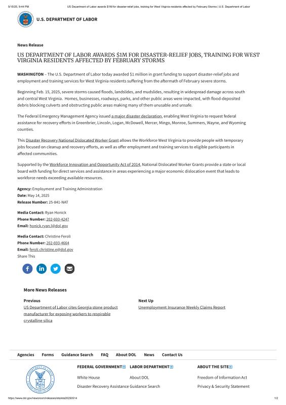 dropbox/COLLECTION- Government/Dept of Labor/FEMA West Virginia February 2025/US Department of Labor awards $1M for disaster-relief jobs, training for West Virginia residents affected by February Storms _ U.S. Department of Labor.pdf