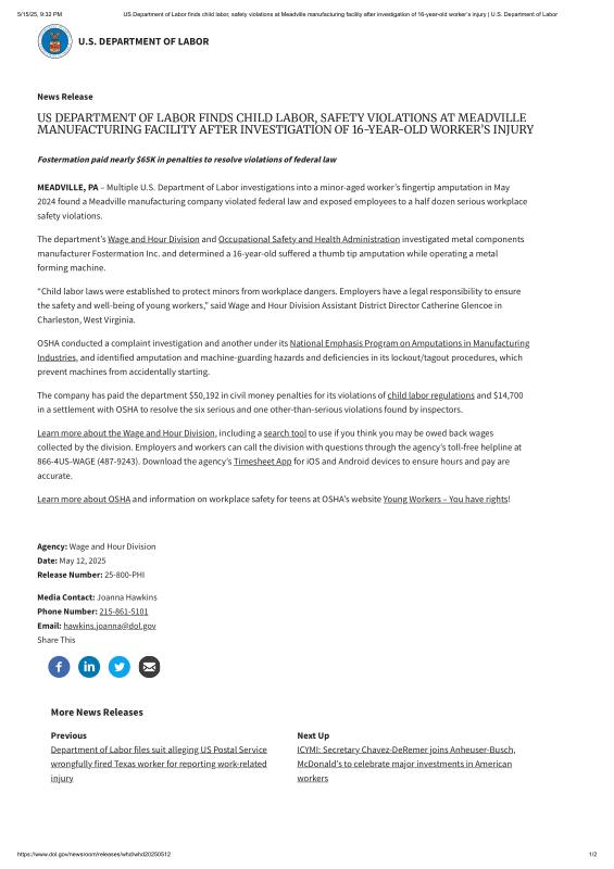 dropbox/COLLECTION- Government/Dept of Labor/Hazardous Conditions/US Department of Labor finds child labor, safety violations at Meadville manufacturing facility after investigation of 16-year-old worker’s injury _ U.S. Department of Labor.pdf