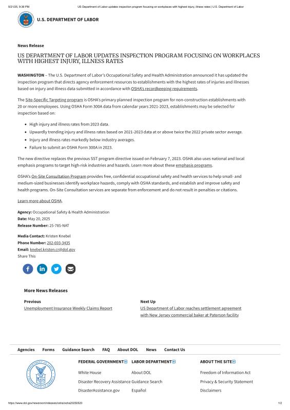 dropbox/COLLECTION- Government/Dept of Labor/Hazardous Conditions/US Department of Labor updates inspection program focusing on workplaces with highest injury, illness rates _ U.S. Department of Labor.pdf