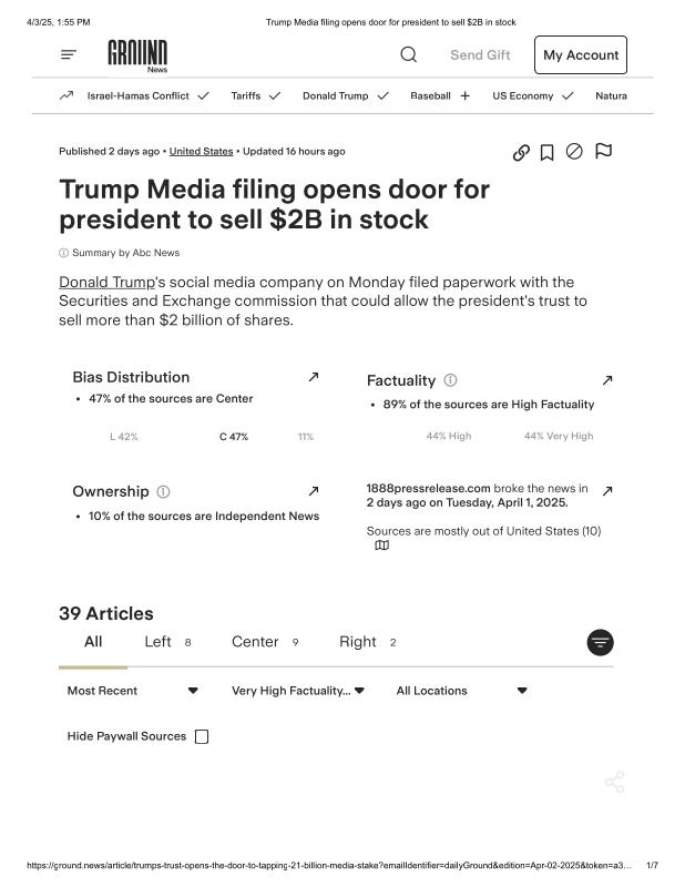 dropbox/COLLECTION- Government/Conflict of Interest-Corruption/Digital Assets/Trump Media filing opens door for president to sell $2B in stock.pdf