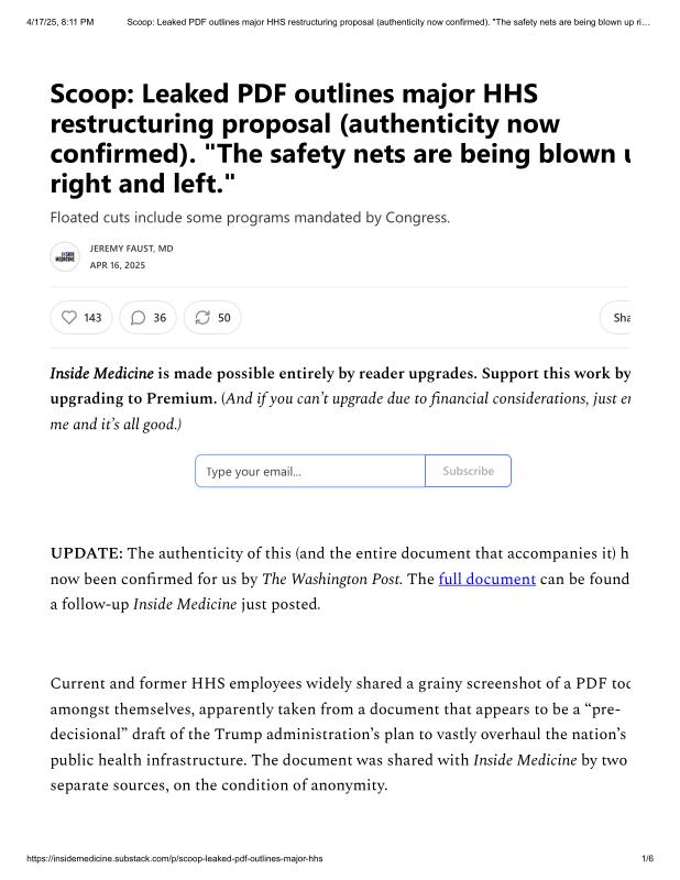dropbox/COLLECTION- Government/Conflict of Interest-Corruption/HHS Cuts/Scoop_ Leaked PDF outlines major HHS restructuring proposal (authenticity now confirmed). _The safety nets are being blown up right and left._.pdf