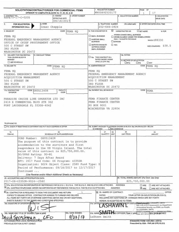 dropbox/COLLECTION- Research/Katrina Batch 1/NARA catalog katrina/fema/FEMA Frequently Requested Records/Paradise Cruise Line Operator- HSFE70-17-C-0205.pdf