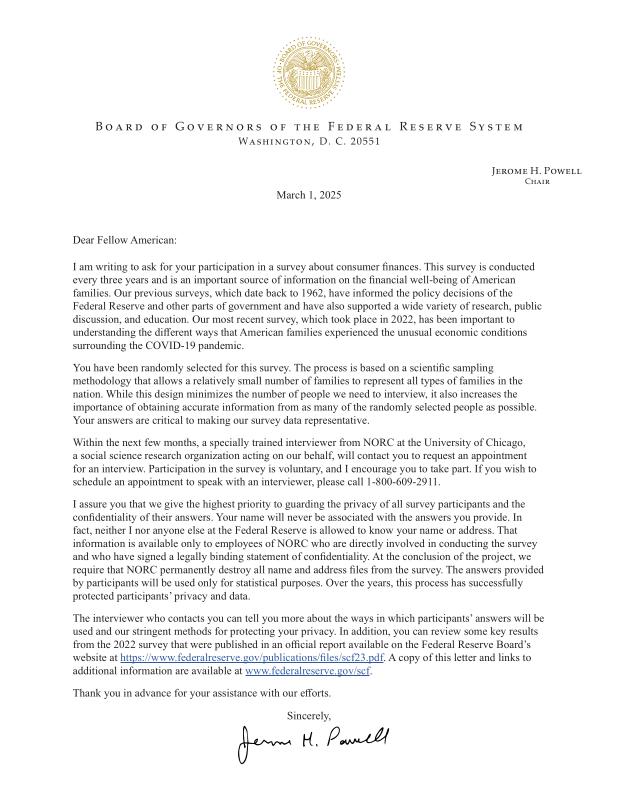 dropbox/COLLECTION- Government/Federal Reserve/Chair Powell's letter regarding the 2025 Survey of Consumer Finances.pdf