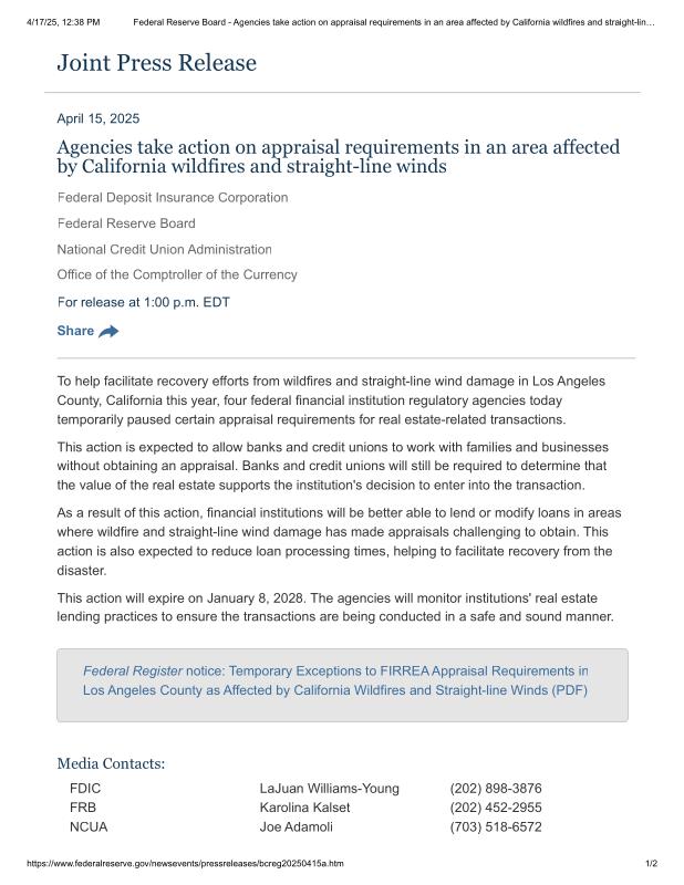 dropbox/COLLECTION- Government/Federal Reserve/Federal Reserve Board - Agencies take action on appraisal requirements in an area affected by California wildfires and straight-line winds.pdf