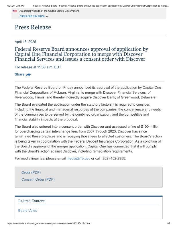 dropbox/COLLECTION- Government/Federal Reserve/Federal Reserve Board - Federal Reserve Board announces approval of application by Capital One Financial Corporation to merge with Discover Financial Services and issues a consent order with Discover.pdf