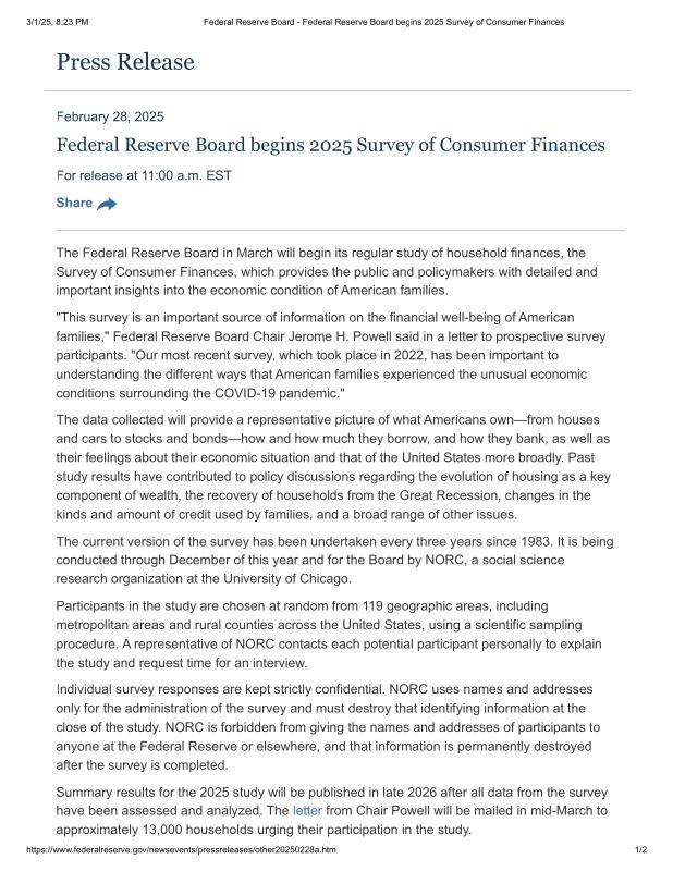 dropbox/COLLECTION- Government/Federal Reserve/Federal Reserve Board - Federal Reserve Board begins 2025 Survey of Consumer Finances.pdf