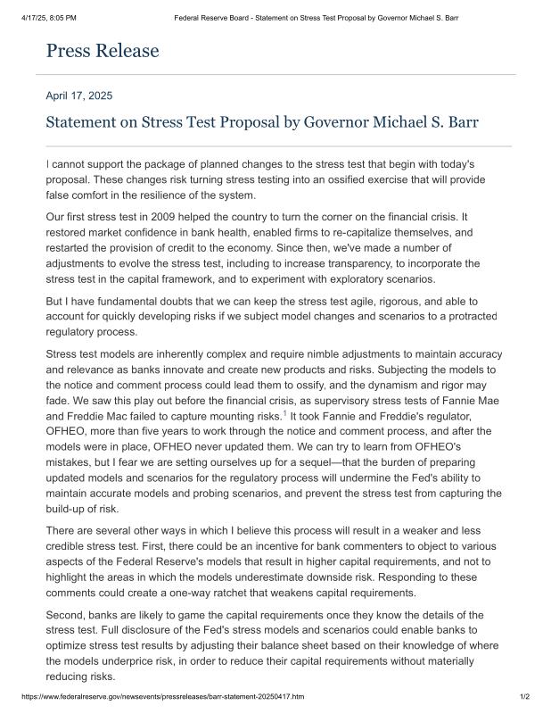 dropbox/COLLECTION- Government/Federal Reserve/Federal Reserve Board - Statement on Stress Test Proposal by Governor Michael S. Barr.pdf