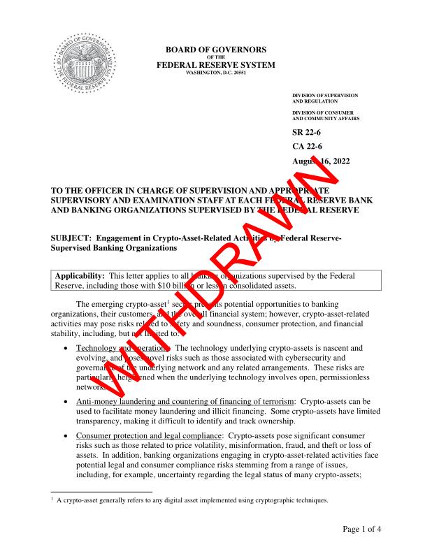 dropbox/COLLECTION- Government/Federal Reserve/FRB_ Supervisory Letter SR 22-6 _ CA 22-6 on engagement in crypto-asset-related activities by Federal Reserve-supervised banking organizations -- August 16, 2022.pdf
