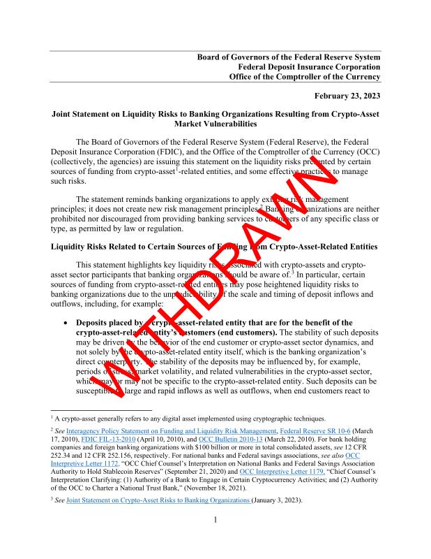 dropbox/COLLECTION- Government/Federal Reserve/Joint Statement on Liquidity Risks to Banking Organizations Resulting from Crypto-Asset Market Vulnerabilities.pdf