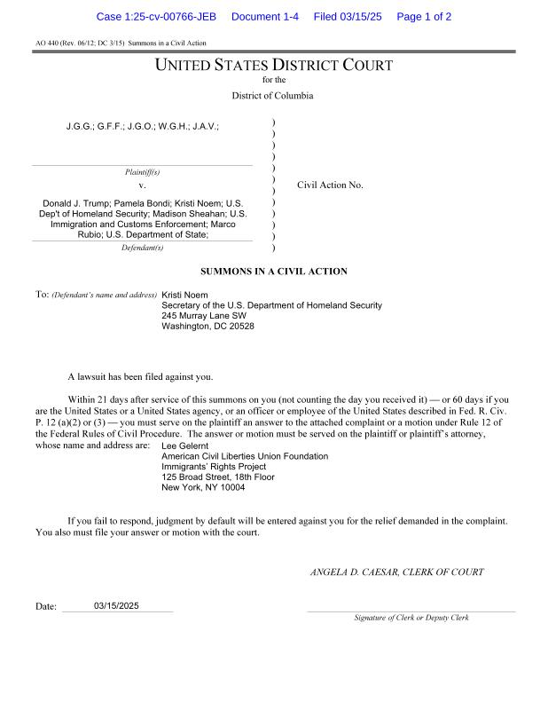 dropbox/COLLECTION- Legal/Court Cases/J.G.G. v. TRUMP 125-cv-00766/Summons - DHS-Kristi Noem.pdf
