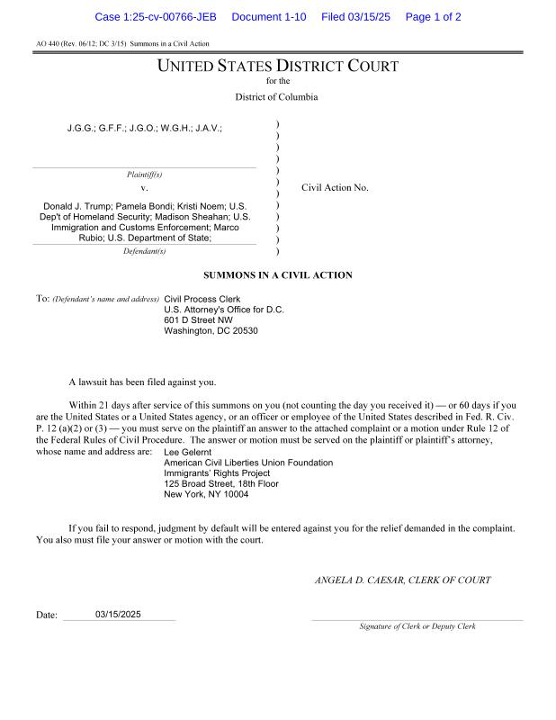 dropbox/COLLECTION- Legal/Court Cases/J.G.G. v. TRUMP 125-cv-00766/Summons - USAO.pdf
