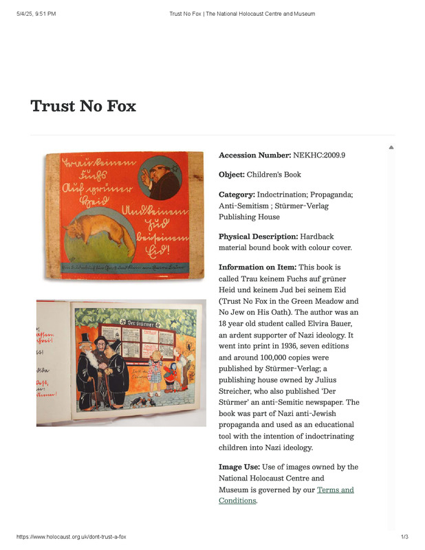 dropbox/COLLECTION- History/Nazi Germany/Related Moments to Now/Israeli Propaganda Book for Children/Propaganda Books in Nazi Germany/Trust No Fox _ The National Holocaust Centre and Museum.pdf