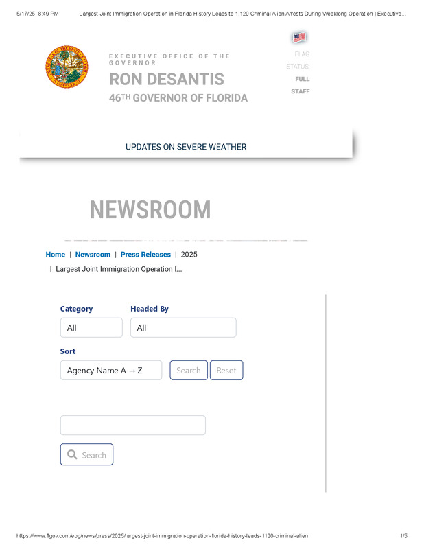 dropbox/COLLECTION- Legal/ICE/Arrests and Raids/Numbers on Arrests and Deportations/Largest Joint Immigration Operation in Florida History Leads to 1,120 Criminal Alien Arrests During Weeklong Operation _ Executive Office of the Governor.pdf
